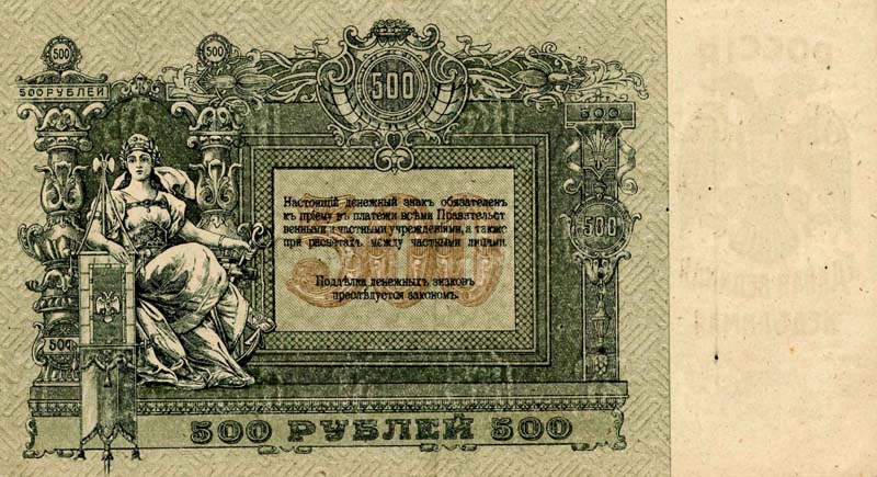The front and back of the 500-ruble note, first issued on 12 February 1919.